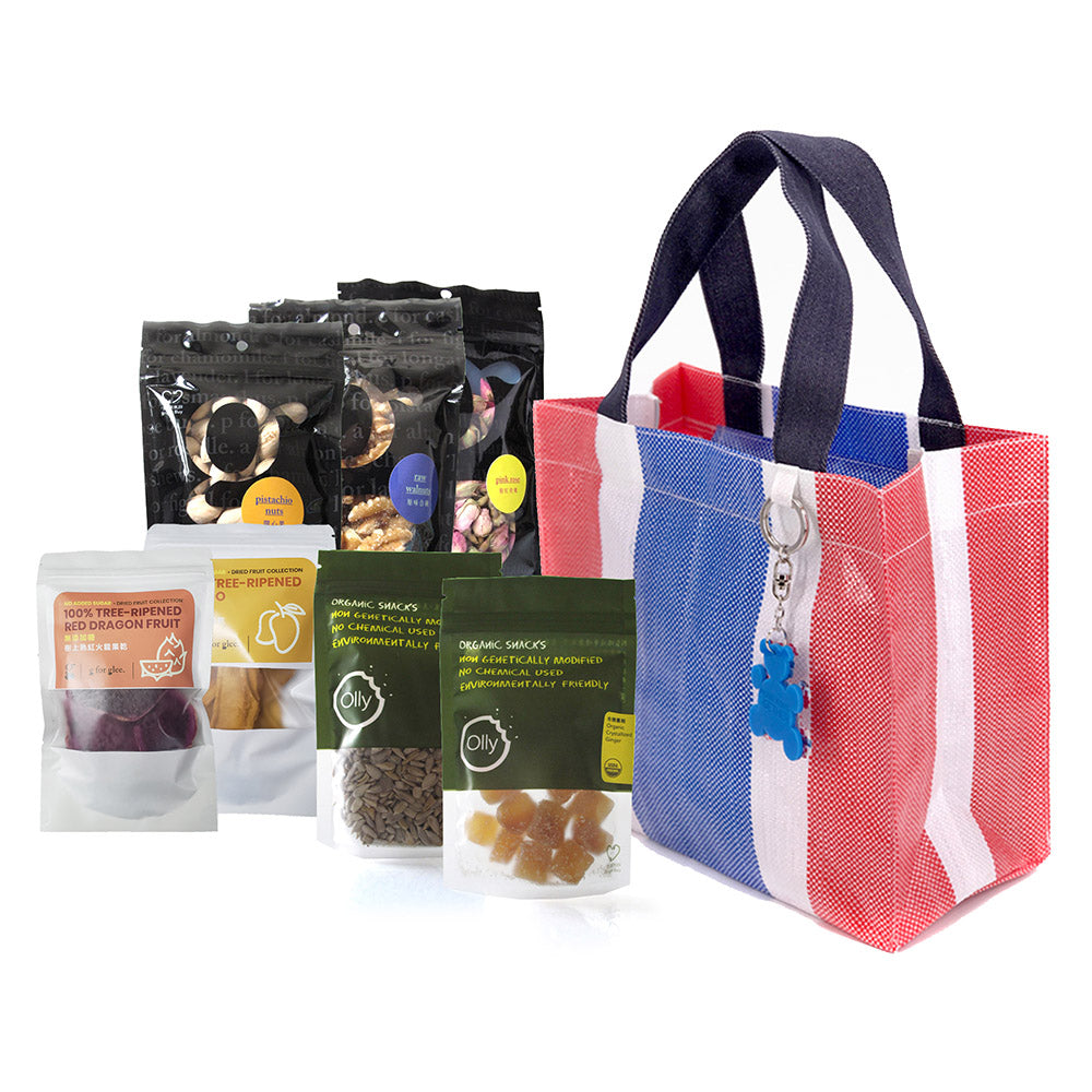 內有:*glee粉紅玫瑰茶30g*glee開心果100g*glee合桃100g*glee 100%樹上熟紅火龍果乾50g*glee 100%樹上熟皇后鳳梨乾50g*Olly有機薑糖70g*Olly有機南瓜籽70g*熊白藍長形手挽袋連2隻熊匙扣(細)