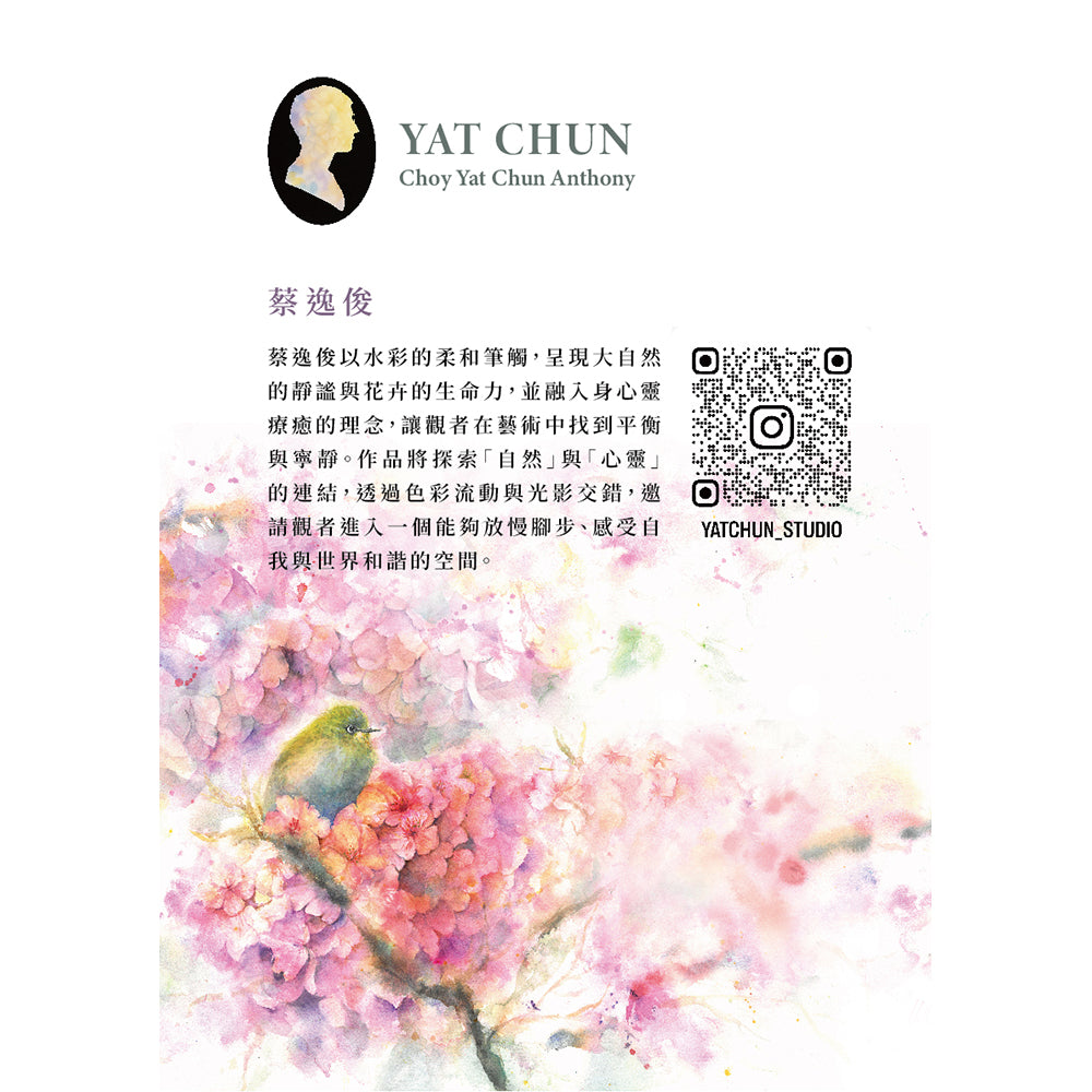 蔡逸俊以水彩的柔和筆觸,呈現大自然的靜謐與花卉的生命力,並融入身心靈療癒的理念,讓觀者在藝術中找到平衡與寧靜。作品將探索「自然」與「心靈」的連結,透過色彩流動與光影交錯,邀請觀者進入一個能夠放慢腳步,感受自我 與世界和諧的空間。